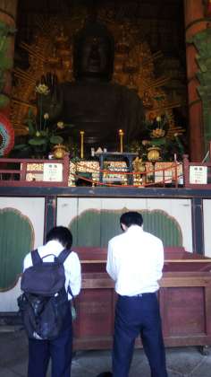 ただいま、梅丘中学校の生徒は東大寺の大仏殿に来ています。ここから、班行動です。みんなで協力して、春日大社や興福寺、正倉院などに向かいます。
