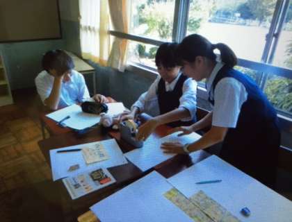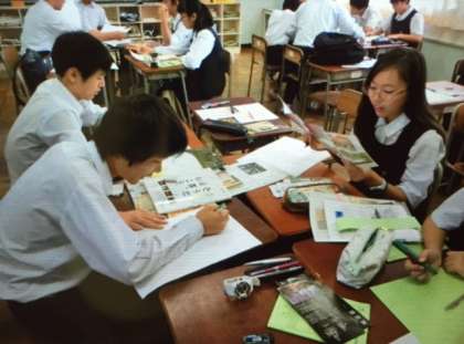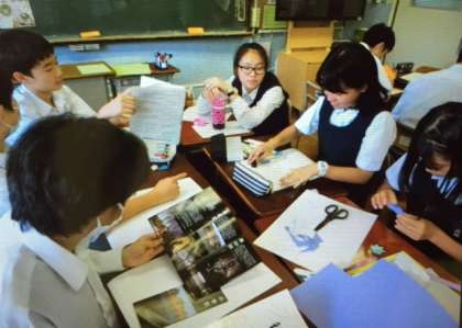 3学年では、修学旅行の事後学習として、新聞づくりを行っています。班員で記事を分担し、ひとり画用紙一枚分まとめます。
