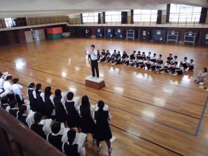 1年生が3年生の合唱練習の様子を見学に行きました。1年生も合唱を披露し、3年生からアドバイスをもらっていました。