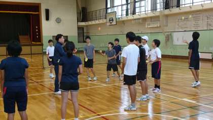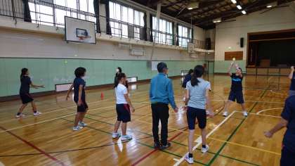 体育の日ですが、あいにくのお天気ですね。硬式テニス部は体育館で活動をしています。今日はウィンザーラケットショップからコーチに来ていただき、ボールを使ったトレーニングを教えていただいています。