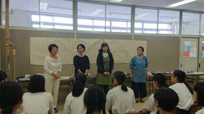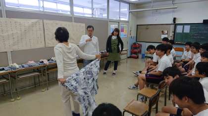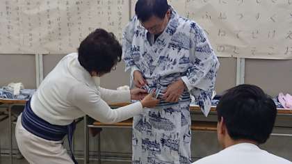 浴衣着付け体験、3年生がクラスごとに、浴衣の着付けの体験をしました。男子は多目的室で、女子は被服室で4人の講師の先生に教わりながら着付けをしました。