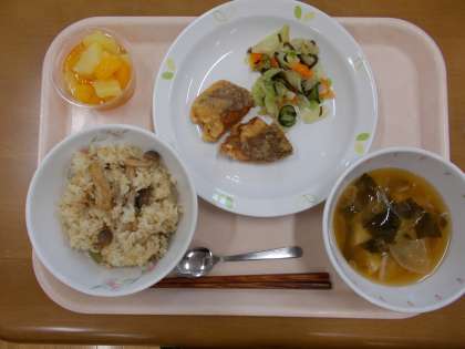 きのこの入ったごはんとカレイの竜田揚げです。