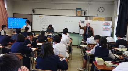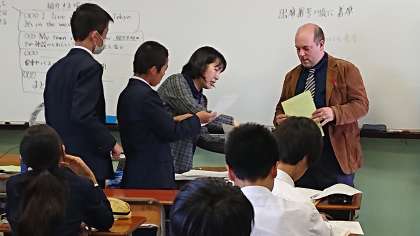 英語の授業2年AC組の少人数授業です。My Town 町紹介の英文をペアで紹介しあい練習をして、清書するため完成度を上げていきます。ALTのクリス先生に質問して発音を聞いたり、林田先生、市来先生、佐藤先生のチェックを受けてしあげます。原稿を見ないで英語でスピーチできるかな?(副校長)