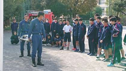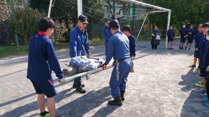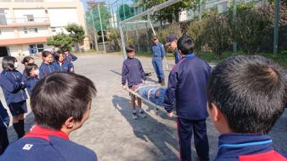 次は校庭でクラス毎に3つの訓練をローテーションで3 搬送訓練をおこないました。(副校長)