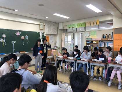 梅丘中の英語科の教員が小学校に行って、「ももたろう」を英語で演じる授業をしてきました。