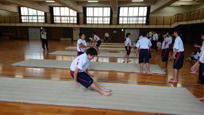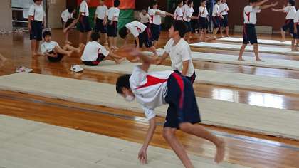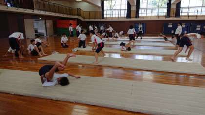 続けてマットを使って、開脚後転、前転、しんしつ後転、倒立倒立前転などをお互いに補助に入りサポートしながら練習します。注意事項は笑ったり、ふざけたりしないこと。手を付く場所、顔の向きが大切、怪我をしないように必ず守りましょう。(副校長)