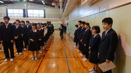 生徒会長からは、ペットボトルキャップの回収競争を行うことが発表されました。「昨年はワクチン247本と交換しました。今年も行いますので、よろしくお願いいたします。」体育委員長からは、「ボールの貸出は自分の生徒手帳と交換でおこなうので、ルールを守って遊びましょう。」とみんなになげかけました。(副校長)