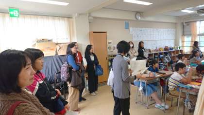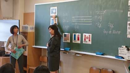 5年1組外国語の授業です。かなりハイレベルな授業です。英語で質問をして、英語で答えています。クイズ形式で進めています。