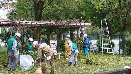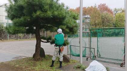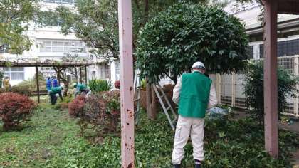 7月に続いて、緑友会の方がたに、ボランティアで、藤棚、ビワの木、松の木などを剪定していただきました。プロの技術を絶やさないため、テクニックを鈍らせないために自発的にやっているそうです。ビワの木の背丈を上げずに、日があたるように、横に広がり実が取りやすいように調整してくれました。そんなこともできるんですね。さすがプロです。(副校長)