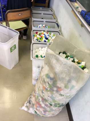 現在、生徒会では各クラス対抗のペットボトルキャップ回収大会を実施しています。楽しみながらもエコ活動の啓発と取り組みを行っています。