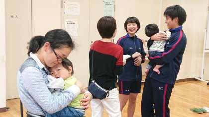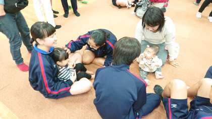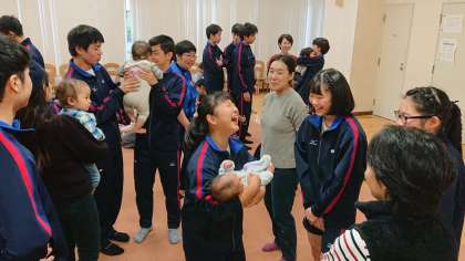 本日2校時の3Cの家庭科の授業では、保育実習で、15組の母子に来校していただきました。前回のAB組から引き続きにさいしょはぬいぐるみや、人形で練習しました。練習後、お母さんの説明を受けて、乳幼児からひとりで立って歩ける子まで、生徒が抱っこしたり、あやしたりして、泣いているこどもを追っかけて、対応しています。(副校長)