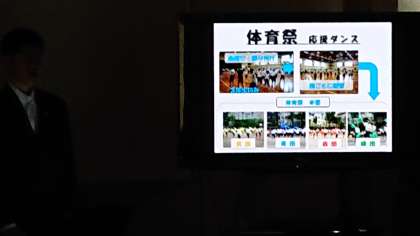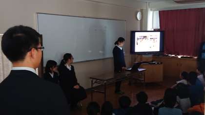 来年から変わる、新しい標準服の紹介、授業時間の違い、教科の違い、部活動の活躍、梅中の2大行事などパワーポイントで作った写真付きの資料で丁寧に説明しています。