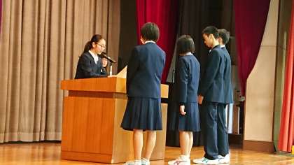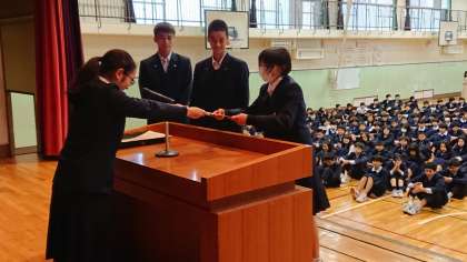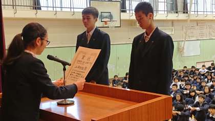 生徒会エコキャップキャンペーンの表彰式がありました。各学年1位は1B,2B,3Cでした。その中で学校で1番多く集めたのは16.4kgを集めた2Bでした。副賞として、染谷先生の直筆の色紙がプレゼントされました。全体総合で82kgものキャップが集まりました。これで沢山のワクチンが造られて、多くの子どもの命が救われます。(副校長)