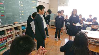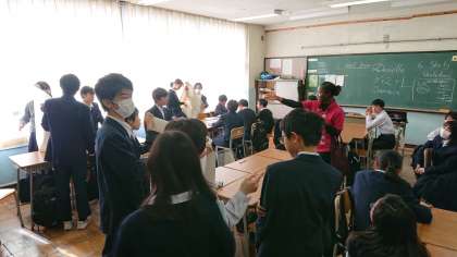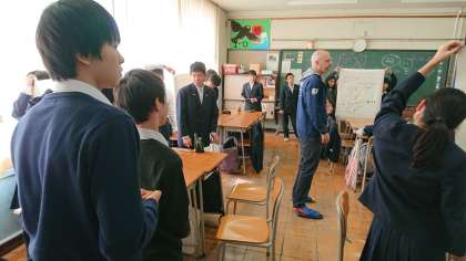 模造紙を使ってパラリンピックの競技を班ごとに英語で発表、説明しています。(副校長)