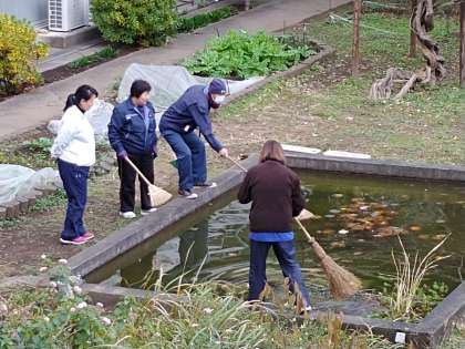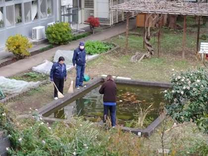 学校主事さんが中庭の池のたまった落ち葉を掃除してくださっています。