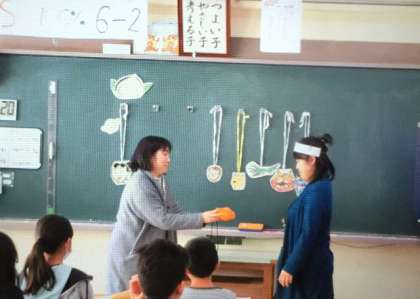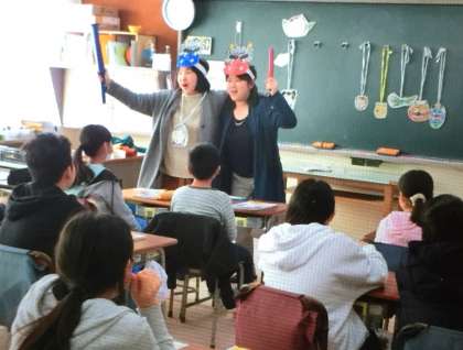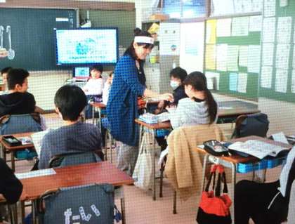 英語科の教員が代田小学校で英語の授業を行いました。テーマは英語版の「桃太郎」のお話です。