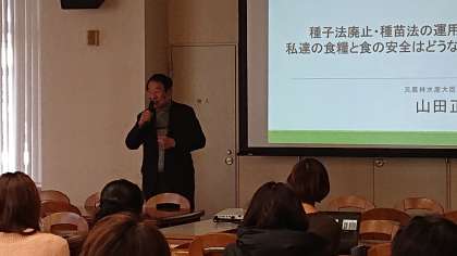 「知らないことがいっぱい!?後退する日本食の安全」台風で中止になっていましたが、本日晴れて開催されました。講師には、弁護士・元農林水産大臣の山田正彦様にきていただきました。締めの講評では、社会教育指導員の原田武司様にお言葉を頂きました。