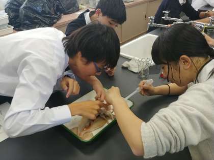 イカを解剖しながら丁寧に観察することで、生物の体につくりを理解していました。