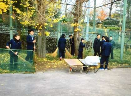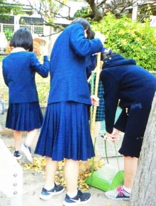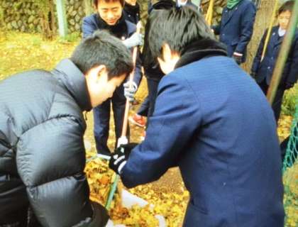 バスケットボール部の生徒が早朝から集まり、校庭の落ち葉掃きをしてくれました。