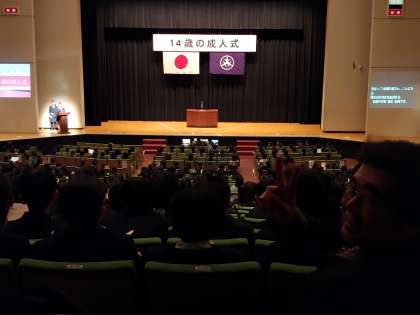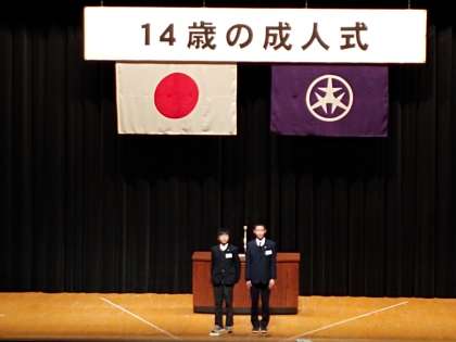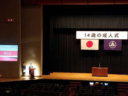 14歳の成人式が開式しました。会場は各中学校の代表の1年生でいっぱいです。