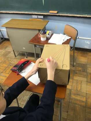 三年生の数学の授業では、立体の平面上の最短距離を考えてます。実際に、直方体に線を描いて比べています!