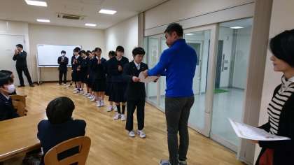 その後、先週行われた百人一首大会の表彰がありました。クラス対抗部門での優勝はA組です。個人部門での1位、学年の名人となった生徒は2試合で109枚も取りました!