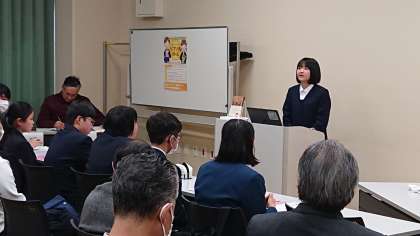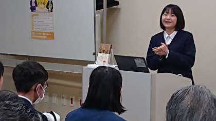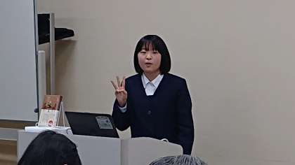 Aグループ4番手 2年長尾さん「コーヒーが冷めないうちに」【川口 俊和 著】前の発表者たちも何回も練習を積んできているので、なかなか手強いです。質問も沢山飛んできます。堂々と答える態度に自信が現れています。(副校長)