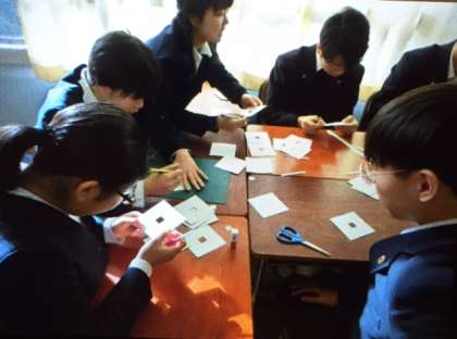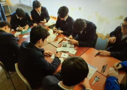 安全に気をつけて、はさみやカッターを使いながら厚紙を切り抜いています。