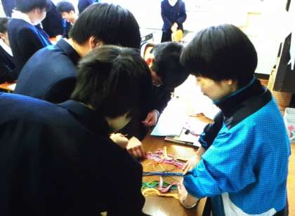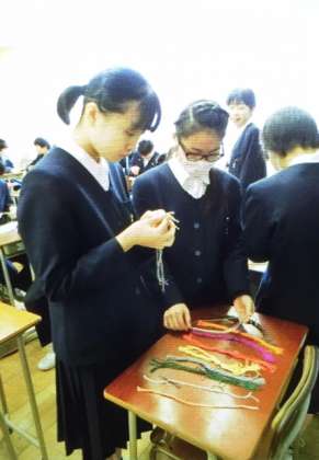 日本語では、「編む」をテーマに日本文化に触れていきます。早速、刺繍ひもを選び、組紐を作ります!