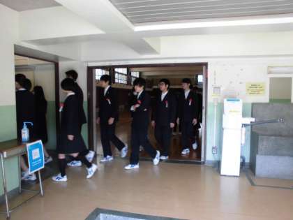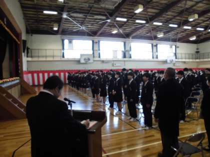 10時 開式のことばの後、国歌と校歌はCDで伴奏が流れ、歌は声を出さずに心の中で歌いました。