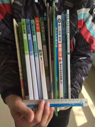 当日配布する教科書は、全部で14冊あります。重ねてみると12センチ程度の厚みになりました。重さはどのくらいあると思いますか?