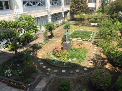 中学校の中庭は草花がとても綺麗に花を咲かせています。鳥たちのさえずりが、穏やかな気分にさせてくれます。