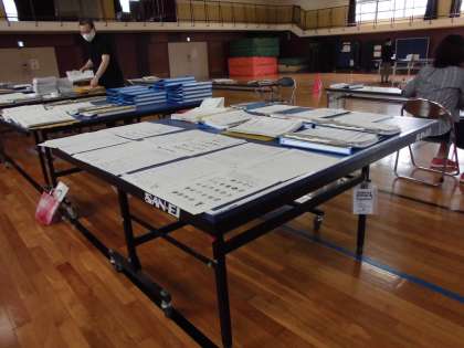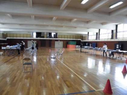 暑くもなく寒くもなくちょうどよい気温の今日は、1年生の分散登校日です。格技室には、各自が各課題を提出する場所や前回の返却課題と新たな資料を受け取る場所が、それぞれ間隔をあけて設けられていて、格技室を一周すると提出・受け取りが完了するシステムになっています。