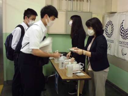 まず登校してすぐ、健康観察表の提出と同時に体調の確認がありました。学校からは生徒用のマスクが配られました。