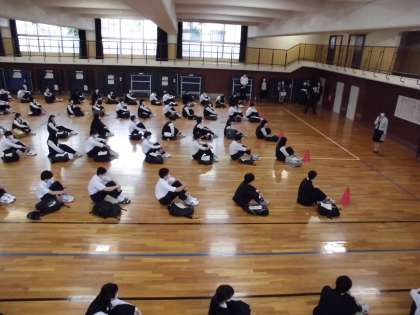 次に格技室に行き、旧クラスで整列。その後新クラス名簿が配付され、先生の指示の順に、自分の新クラスのところへ移動して並びなおしました。