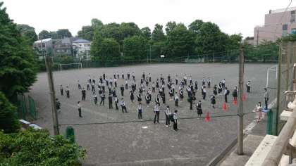2年生は4クラスあり、人数が多いので、旧クラスで校庭に集まりました。出席確認と新しいクラスの確認が終わり、下駄箱の新クラスの所に下履きを入れて格技室に入場します。