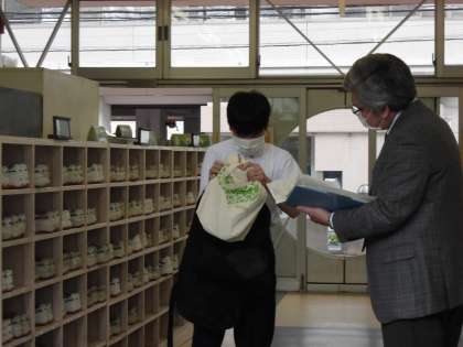 玄関を通過するときに、健康観察表を提出し、旧クラスで離れて並び、新クラス名簿が配布されるのを待ちます。