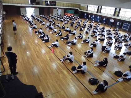 新クラスに並びなおした後は格技室に移動し、着任式、始業式、学年集会に参加しました。