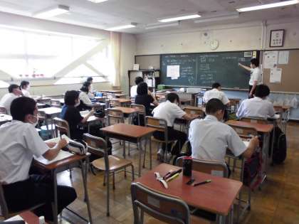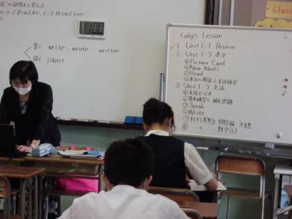 今、3年生の英語の授業では、受動態(受身形)を使った表現を学んでいます。授業の流れが板書してあるので、生徒も授業の途中で迷うことがありません。先生の指示によくついていっています。