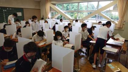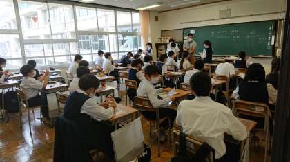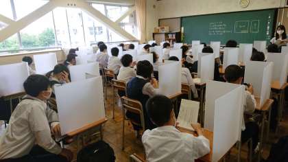 パーティーションをつけて、ソーシャルディスタンスをあけた、座席で授業を受けます。