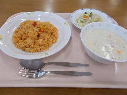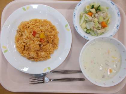 今日の給食では、そのアメリカ料理の献立を実施しました。