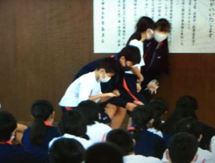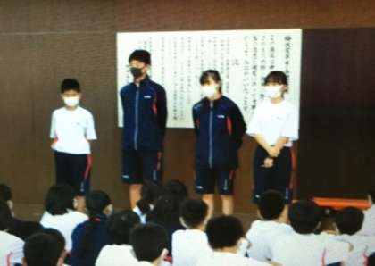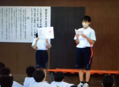 1学期最後の学年集会が行われました。各クラスの代表者が1学期の学級の反省を発表しました。寸劇を取り入れたり、画用紙を効果的に用いたりしながら工夫して発表しました。