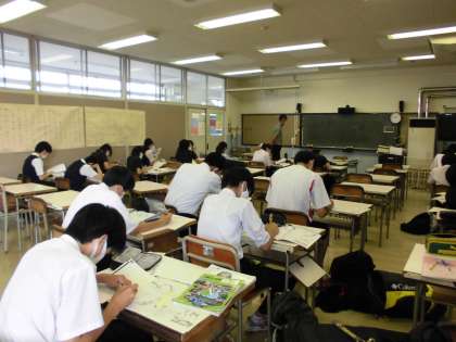 地図帳を広げ、世界や日本の地形(大地、平野、山脈)を記入していました。