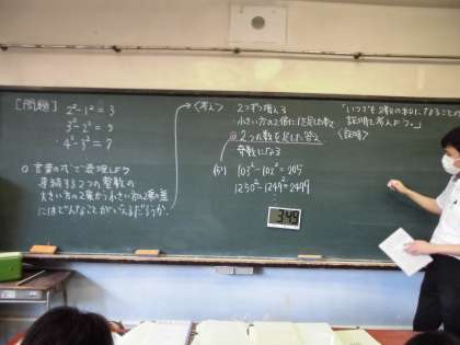 本日は式の利用で、「連続する2つの整数の大きい方の2乗から小さいほうの2乗の差にはどのようなことが言えるか」ということの考え方と証明を行いました。
