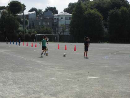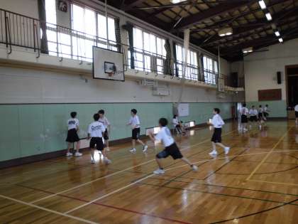 午前中、校庭ではサッカー部、体育館ではバスケットボール部が活動しています。