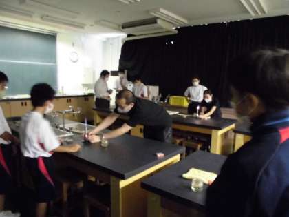 マッチに火をつけ、ガスバーナーの学調節ねじを少しずつ開き、炎の大きさを調整して青い炎にするところまでを、できるだけ短時間で出来るように繰り返し練習しました。