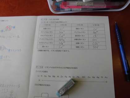 原子とイオンの構造を復習し、「これだけは必ず覚えよう」とイオン式の問題を解いていました。