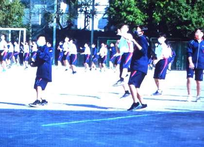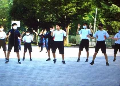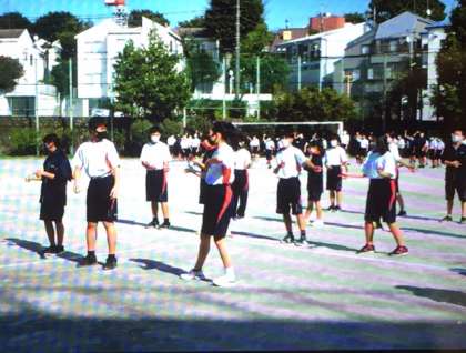 体育祭に向けた練習がスタートしました。初日は青団の応援練習です。青空の下、3学年が集い、応援練習をしました。応援団が中心となって仲間に振付けを教えています。