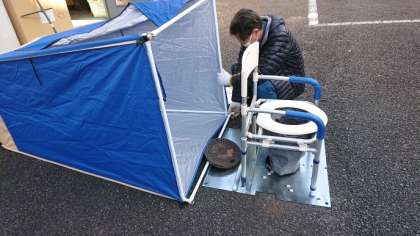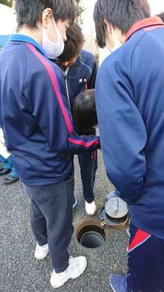 防災倉庫の説明、仮設トイレ取扱い説明をおこなっています。実際に使用する時は、生徒のみんなが組み立てられるように覚えておきましょう。手動ポンプや下水道へ流す閉鎖扉の引き上げ等、力仕事が多いです。