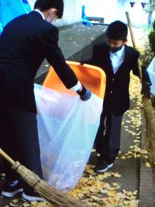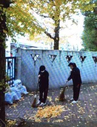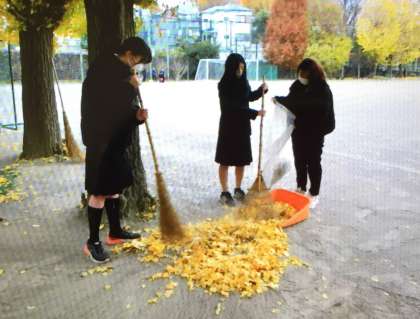 今朝、1、2年生の美化委員で校庭や校舎周りの落ち葉はきをしました。